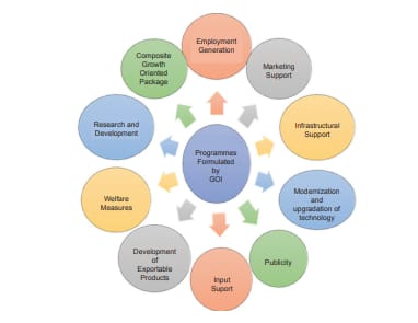 - b) Export Promotion:Under this component, assistance is given for export projects, participation in international fairs and exhibitions and setting up of design studios with the main objective of assisting handloom cooperative societies, corporations/Apex and handloom exporters to participate in international events, buyer-seller meets, etc. and to make available the latest design trends.